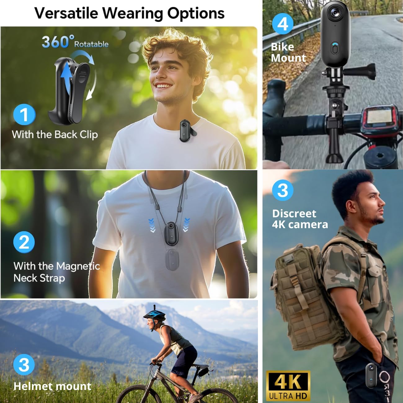 ππΌ ONE CLIP WEARABLE ON NECK: Comfortable body camera small, wearable as easy to use with the magnetic collar, this thumb camera have sport body material designed for outdoor activities and vlogging, featured with full accessories, mount bike and motorcycles, hat clip, mount helmet, connector for tripods, waterproof case up to 30M protection, clip case, wrist strap, pet collar and more.