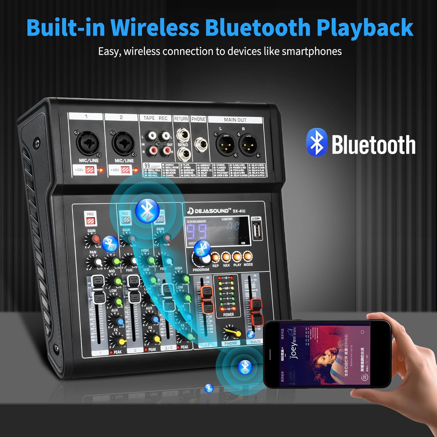 【Achieving Professional Sound Quality with Ease】The Dejasound SX Series 4-Channel Audio Mixer provides beginners with an efficient and easy-to-use audio processing solution, especially for small-scale events, home recording, and live streaming. Its simple and intuitive operation meets various audio needs, helping users achieve professional-quality sound without the need for complex setups