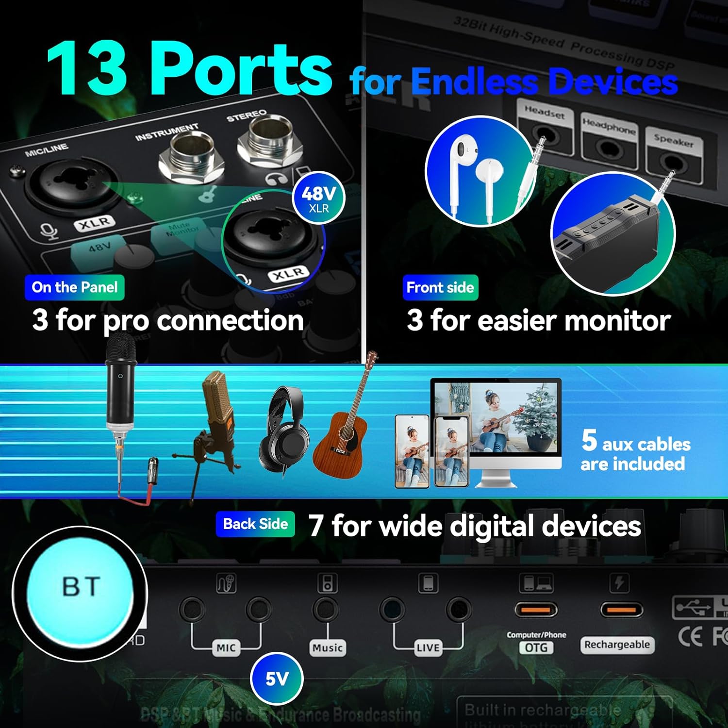 FRONT MONITORING FOR REAL-TIME CONTROL : With 3 headphone monitoring ports on the front panel, audio mixer SN800 allows instant access for real-time listening, helping you balance sound levels and make accurate adjustments during recording.