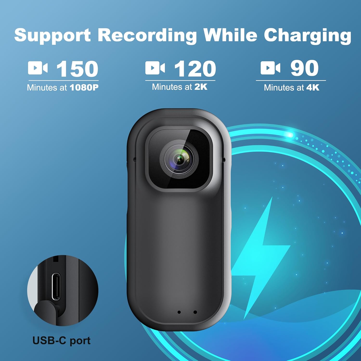 [Long-Lasting Battery + Portable Charging Case]: Comes with a 1800mAh charging case for non-stop power. The 450mAh camera records up to 150 mins (1080P), 120 mins (2K), 90 mins (4K) — ideal for outdoor trips, travels and daily use.