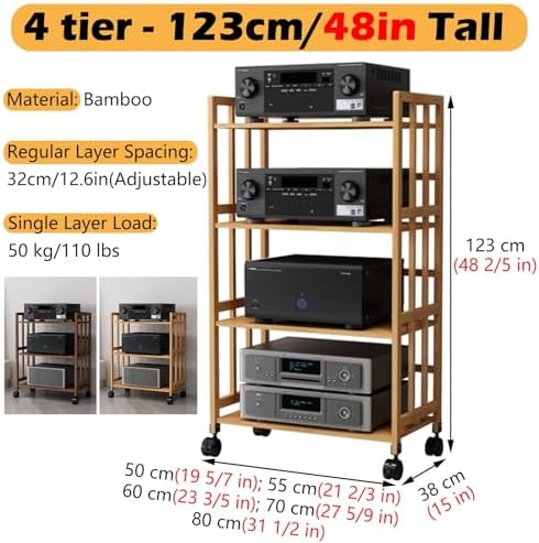 Are you looking for a stylish and functional storage solution for your electronic devices? Our versatile media rack is the perfect choice for organizing your receiver, CD player, and more while enhancing your living space. **Specifications:** – Material: Bamboo – Color: Natural, Brown – Number of Tiers: 2 – Adjustable Shelf Spacing: 8 cm / 3.1 in – Load-Bearing Capacity per Shelf: 50 kg / 110 lbs – Assembly Required: Yes – Suitable for: Home, Office, Shop, Theater, Bedroom, Living Room **Features:** – Sturdy construction supports a wide range of audio/video components, ensuring long-lasting durability and reliability. – Adjustable shelves provide flexible storage options to accommodate your unique needs. – Equipped with four lockable rolling wheels for easy mobility, allowing you to reposition the rack effortlessly. – The open design promotes airflow, keeping your devices cool while ensuring they remain easily accessible. – A modern aesthetic complements any decor, adding a touch of sophistication to your home or office. – Perfect for small spaces, this multifunctional piece can serve as stereo storage, an end table, or a stylish TV stand. – Optimize your floor space with this media stand, helping you maintain a tidy environment. – Constructed with a combination of solid wood and metal frame, providing enhanced stability and load capacity. **Package Includes:** – 1 x AV Cabinet (other items shown in pictures are not included) **Note:** – Please allow a measurement error of 1 to 3 cm due to manual measurement. – Product colors may vary slightly from photos due to lighting, camera settings, and screen resolutions. Transform your home entertainment experience and keep your space organized with our premium media rack, designed to meet your storage needs while adding elegance to your surroundings.