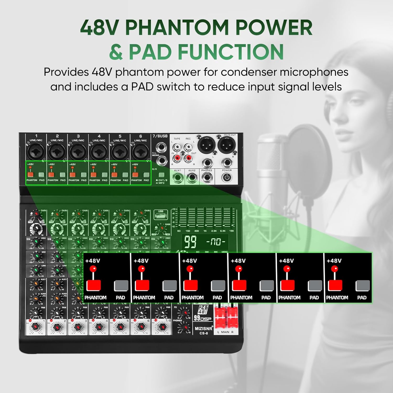 Independent PAD & Phantom Power Functionality: Adjust input levels to perfection using the individual PAD switch and 48V phantom power per channel. Ideal for both sensitive condenser mics and high-output instruments such as DI boxes or electric guitars. Fully supports wireless microphones and dynamic mic setups.