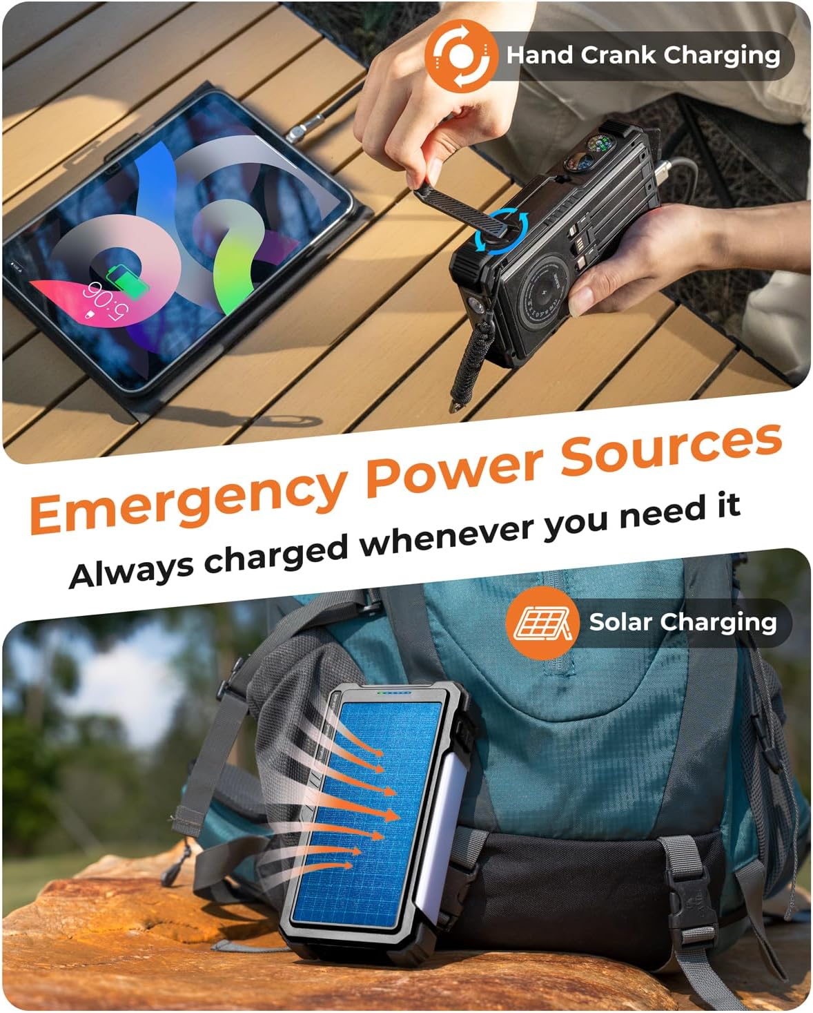 Upgraded Hand Crank Power Bank: BLAVOR solar charger power bank features cutting-edge technology to combine a solar charger and hand crank generator in one. Simply rotate the handle to produce instant power anytime. With one minute of cranking, you get up to five minutes of reliable emergency lighting, perfect for power outages, camping, hiking, or outdoor adventures