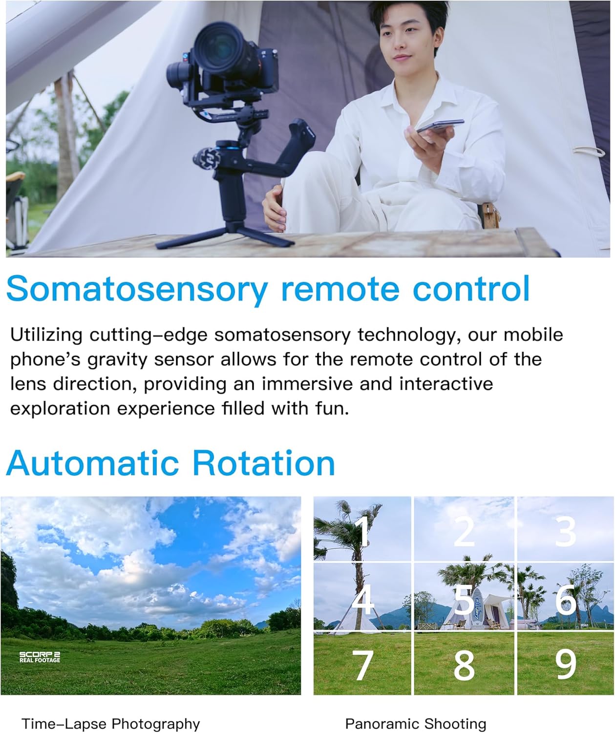 đˇăScrop App, Unlock Various FunctionsăConnecting to the Feiyu SCORP App allows you to access even more professional settings, such as parameter adjustment and somatosensory remote control which enables our mobile phone’s gravity sensor to achieve the remote control of the lens direction, providing an immersive and interactive exploration experience filled with fun.