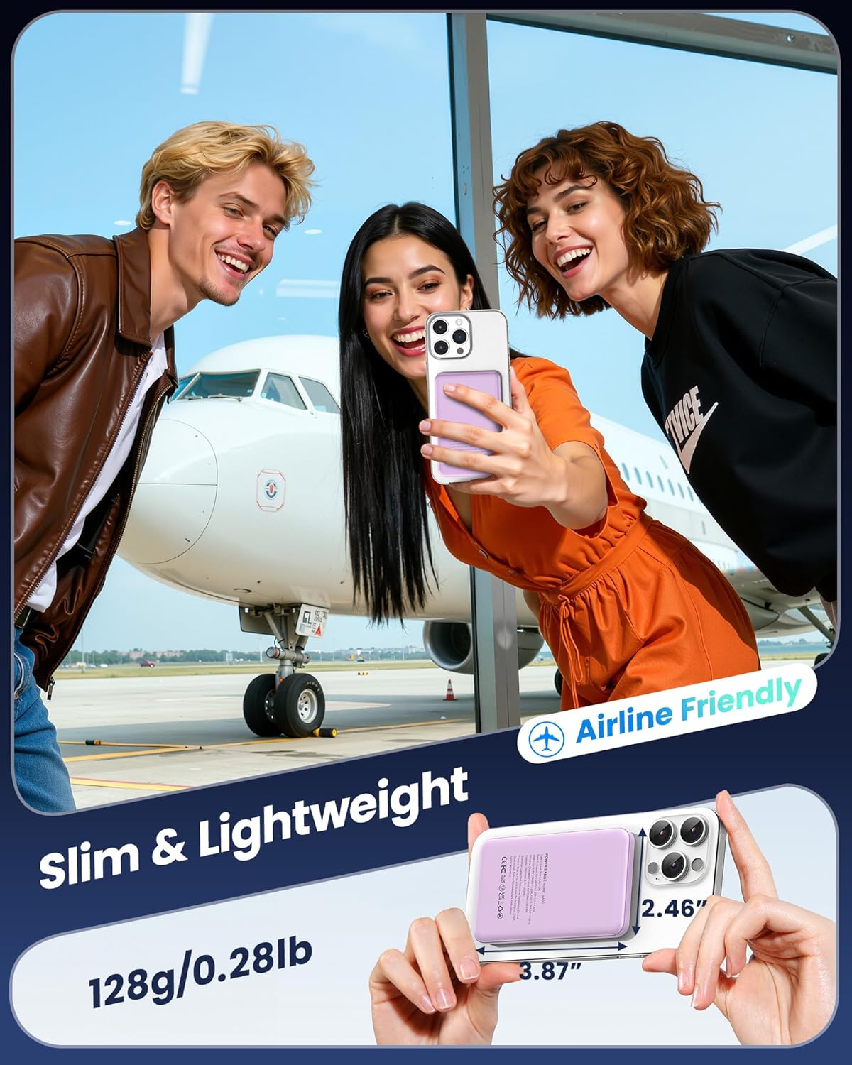 Lightweight and Portable: Measuring only 3.87*2.46*0.57 inches and weighing 128g/0.26lb, it fits easily in your hand or into your pocket. It’s perfect for charging your devices on the go without adding bulk. It’s also a must-have for airplane travel.