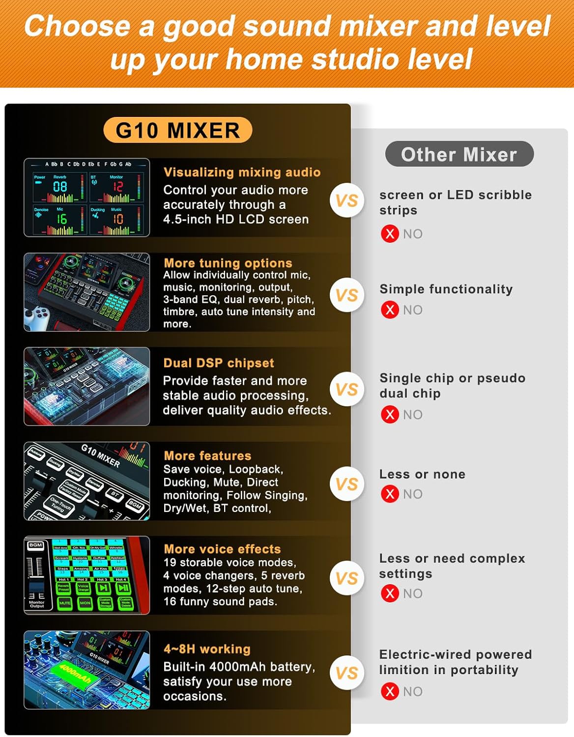 G10 Audio Mixer Sound Card, Professional Podcast Production Studio with 3-Band EQ, Dual Reverb, 19 Voice Modes, LCD Display (G10 Sound Card-Red)