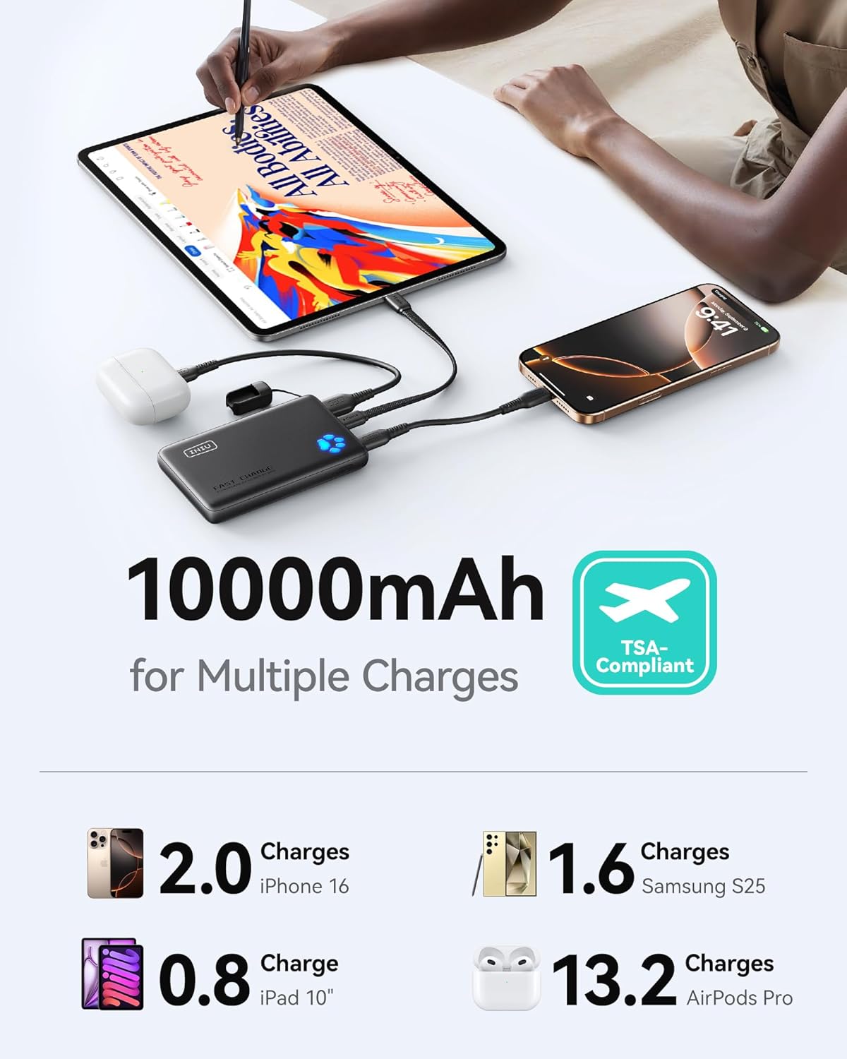 What You Get: INIU 10000mAh portable charger*1, 0.12M/0.4ft Lanyard USB-C to USB-C Cable*1, user manual*1, and Industry-Leading 3-Year INIU Care, plus Lifetime Technical Support.
