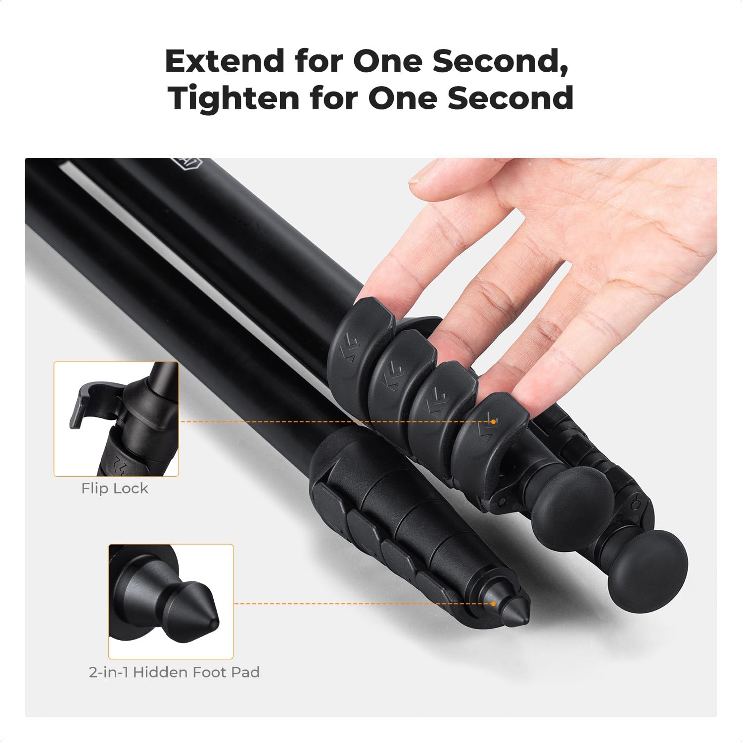 【Flexible Height Adjustment】With a 5-section leg design and adjustable 2-stage leg angles, the tripod offers a height range of 17.3” to 64”, allowing users to quickly set the desired height, making it versatile for various shooting situations.