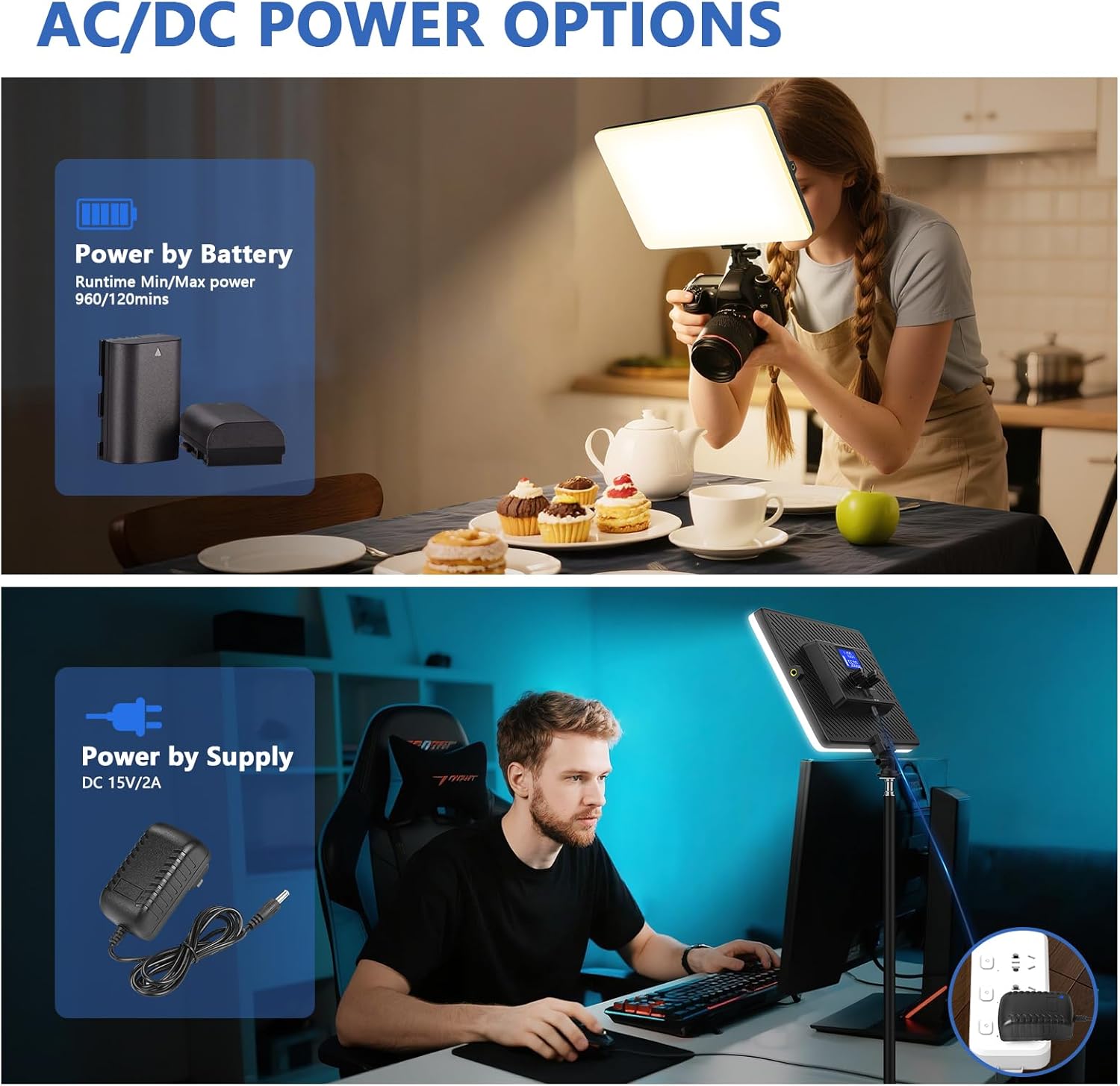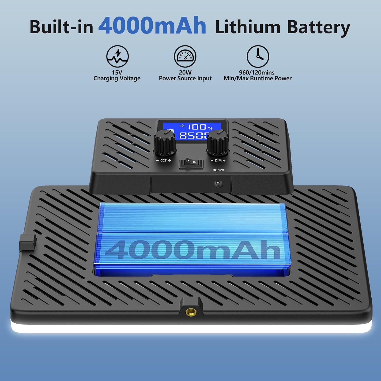 【4000mAh Rechargeable Battery & AC Power Charger】: The 20W light kit built-in 7.4V /4000mAh rechargeable lithium battery for up to 120 minutes of continuous lighting at 100% brightness and 960 minutes operation at 10% brightness, You can also power the light by the included AC power charger (3 hours to complete the charging using 15V/ 2A quick charge), ensuring uninterrupted power throughout the day. The Overheating Protection function will make long light life. Allows you to take video easily.