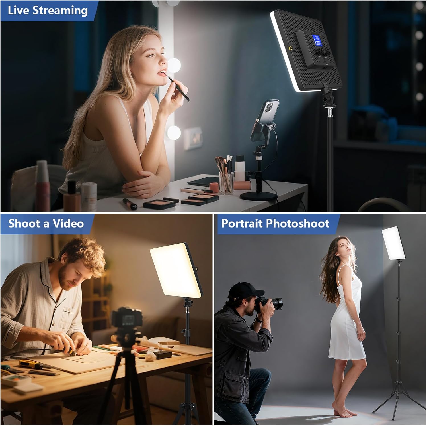 【Larger LED Light Panels】: The bi-color video light have 12” larger lighting panels. There are buttons on the back of the light board (-CCT+, -DIM +) that allow you to switch between 2500-8500K light scene modes, and power via AC charging power. Solution for indoor/outdoor photographers, filmmakers, studio photoshoots, content creators, podcast videography, YouTube/TikTok social media influencers, makeup artists, portraits etc.It is really a multi-functional and multi-purpose bi-color light.