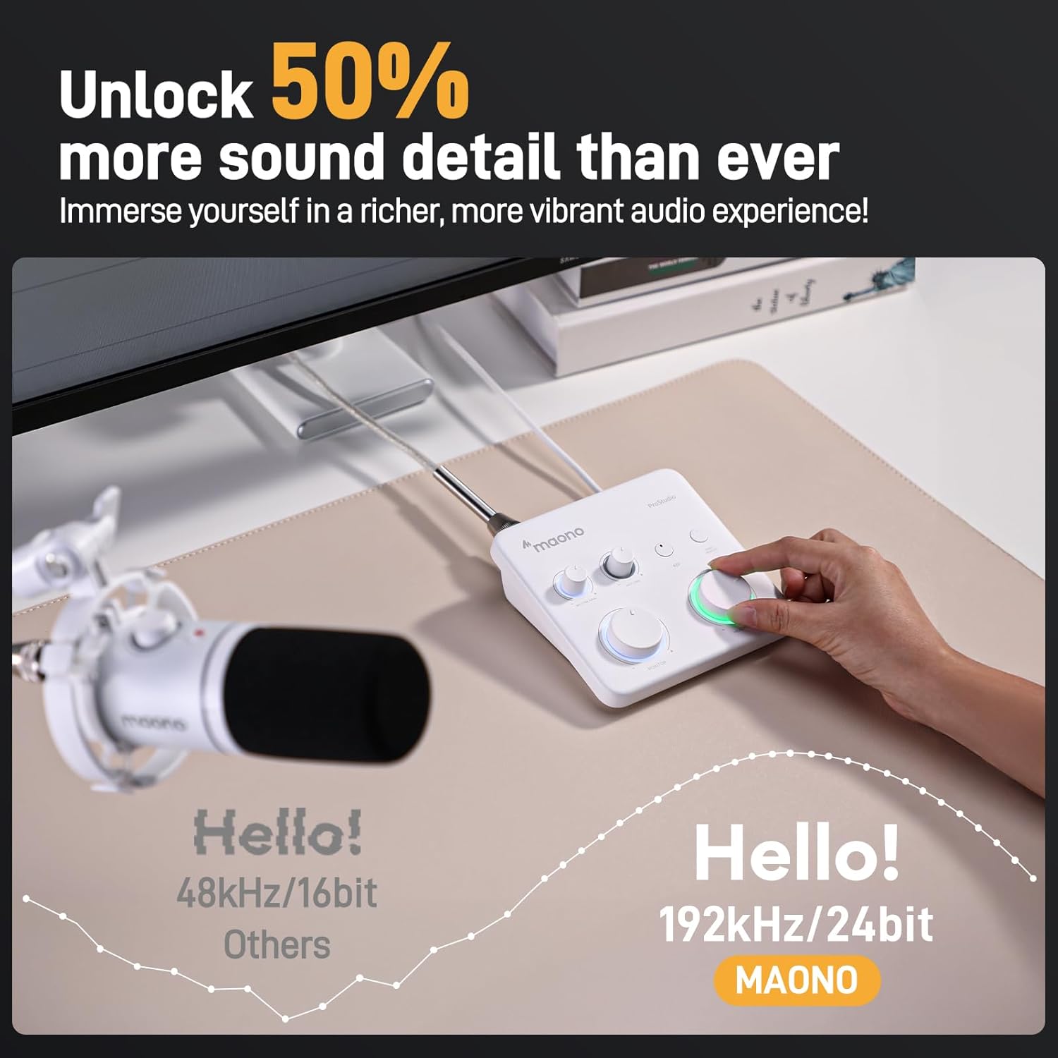 Capture every detail of your sound: Imagine the perfect take, every note and beat, captured as if by magic. That’s the MAONO PS22 Lite audio interface—designed for the recording enthusiast and streamer in you. With high-resolution recording at 24-bit/192kHz and a dynamic range of 106dB, this USB audio interface for PC and Mac ensures your sound is as clear and realistic as the original performance