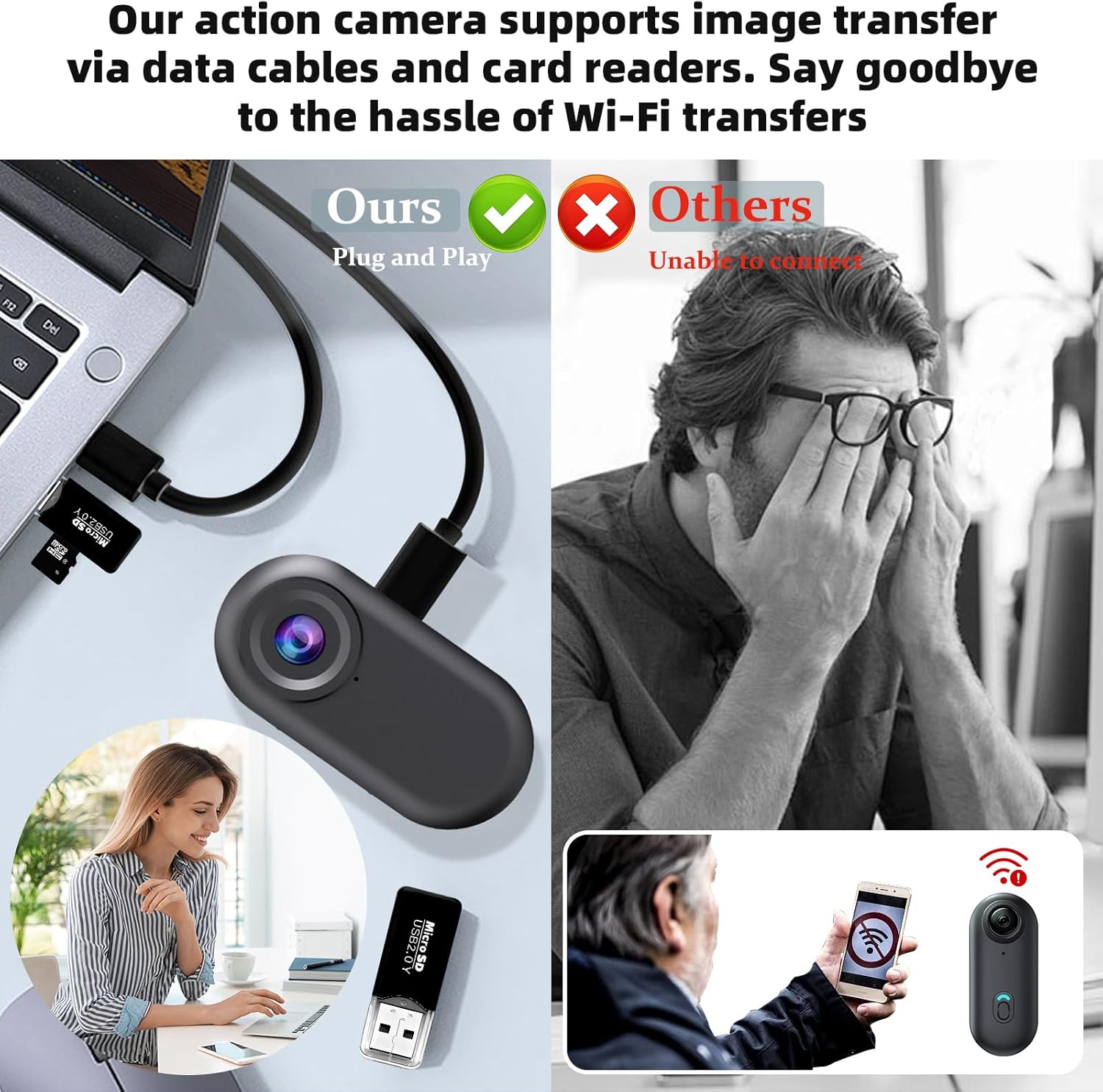 [Multi-Function Recording + Wired Transfer] This bodycam offers versatile features including video recording, audio capture, loop recording, and playback. Recorded content can be transferred directly to your phone or computer via a data cable or card reader, eliminating reliance on unstable Wi-Fi connections and preventing issues like connection failures or interrupted transfers. The pocket camera paired with a 128GB TF card, it meets your long-term recording needs.