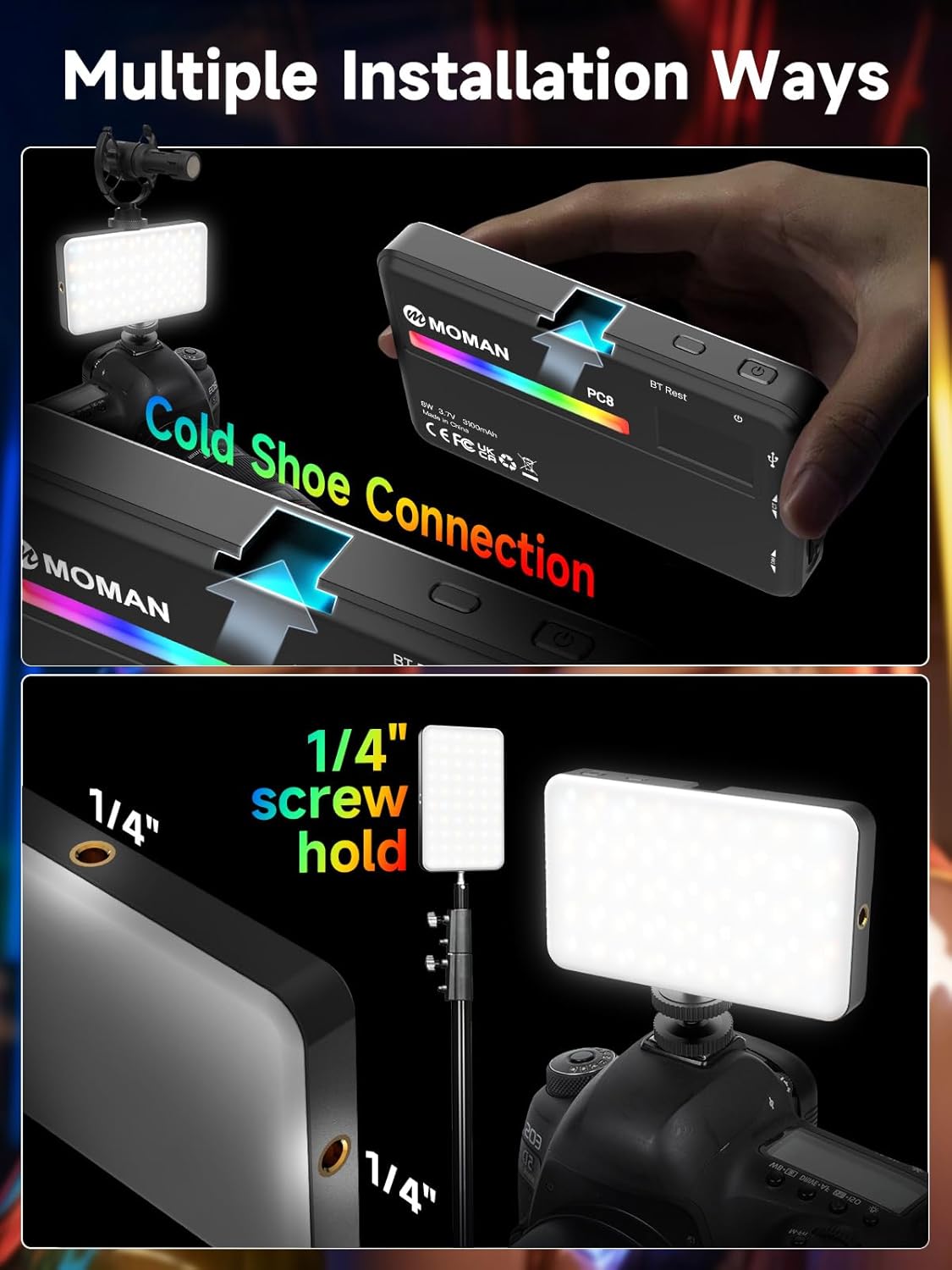 【Easy Control, Cold Shoe + 1/4″ Screw Hole】Wheel design allows step-less and fast adjustment. You could also adjust the cold shoe light via MOMAN Light APP remotely without interrupting filming. The OLED display screen clearly shows the working status wireless connection status, battery life, brightness, etc. Video Lights has a 1/4″ screw hole and include a cold shoe mount for easily installing on DSLR cameras, camcorders, light stands, and tripods.