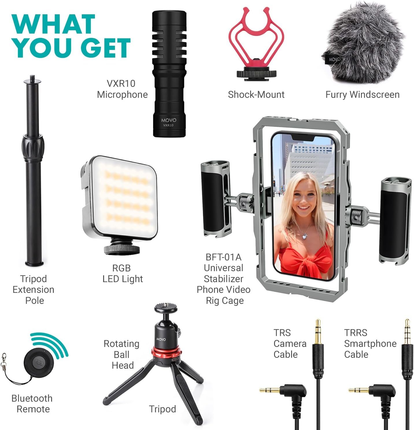 Video Cage, Shotgun Microphone, RGB LED Light, Wireless Remote, Tabletop Tripod, USB-C Output Cable, Lightning Output Cable, Carrying Case