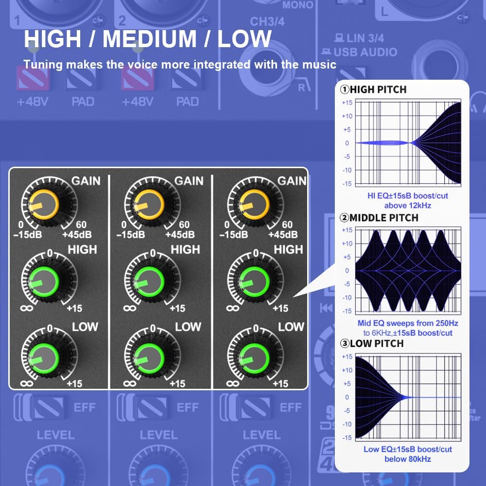 【4 Channel Audio Mixer】Built-in 99 modes digital echo machine, 4 channel DJ mixer with stable power supply, effectively filter the AC signal interference and make the sound more clear and delicate