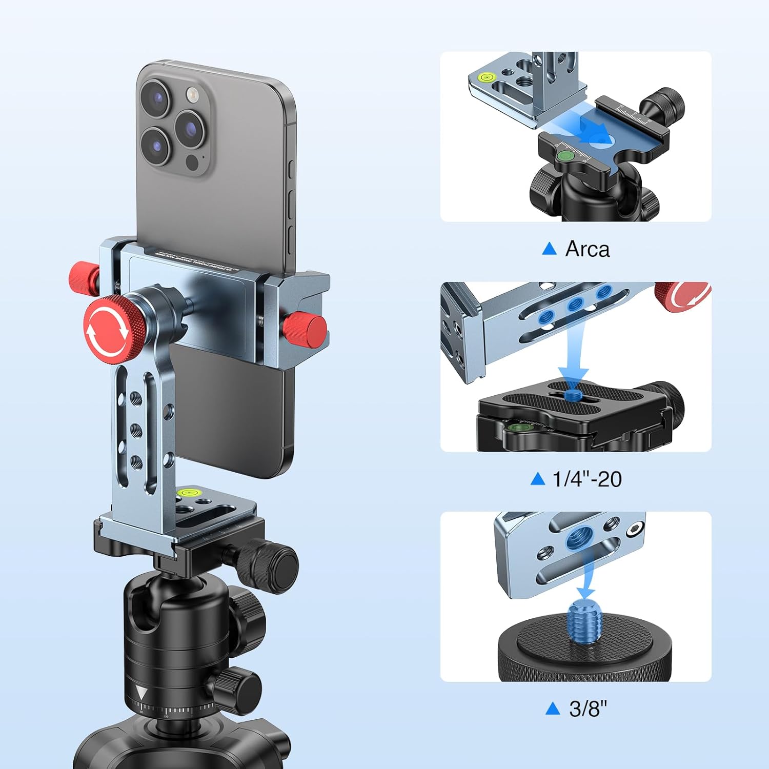 Arca Type Base for Tripod Mounting▶ Designed with an Arca type base, the smartphone tripod mount can be attached to a compatible quick release plate, or it can mount on a mini tripod, tabletop desktop tripod, monopod, light stand, handgrip, and other supports via the 1/4″ and 3/8″ threads