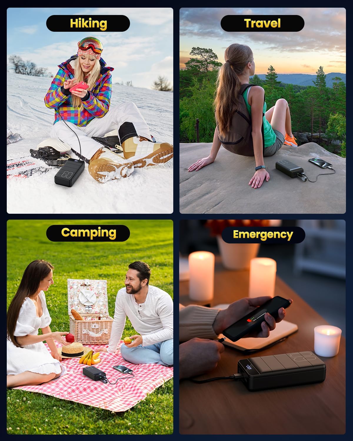 Massive 60000mAh Power Bank: The 60000mAh portable charger power bank can provide multiple full charges for your phone and other devices. The battery pack provides 14 charges for iphone 16, 12 charges for Samsung Galaxy S24, 4 charges for ipad pro. Without extra worry about low power. Ideal choice for traveling, camping, hiking and emergency backup.