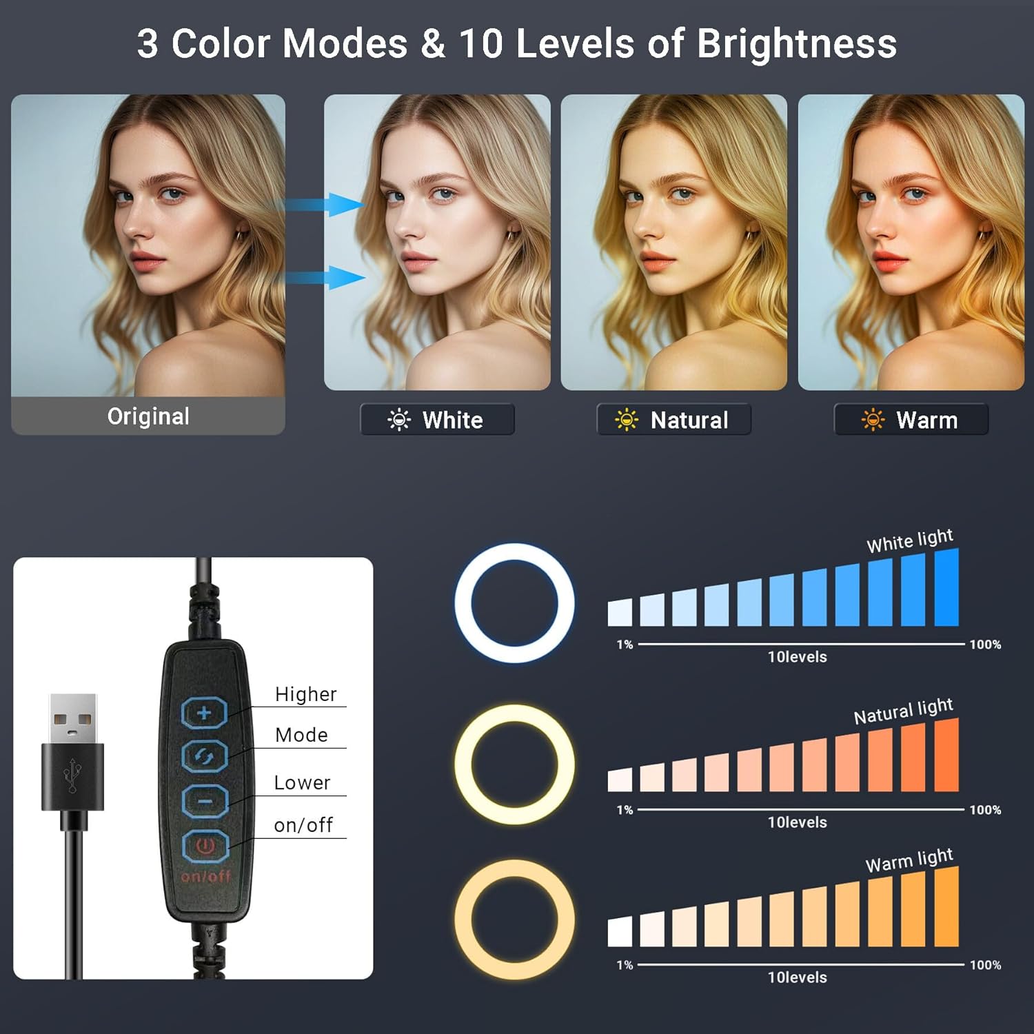 【 3-color Temperature Adjustment 】 The 5’’ desktop ring light has 3 adjustable dimming modes: warm, natural and cool. It has 10 adjustable brightness levels, is powered by 5V USB, and is convenient to move and use. It is suitable for video conferences, video recording, and home office.