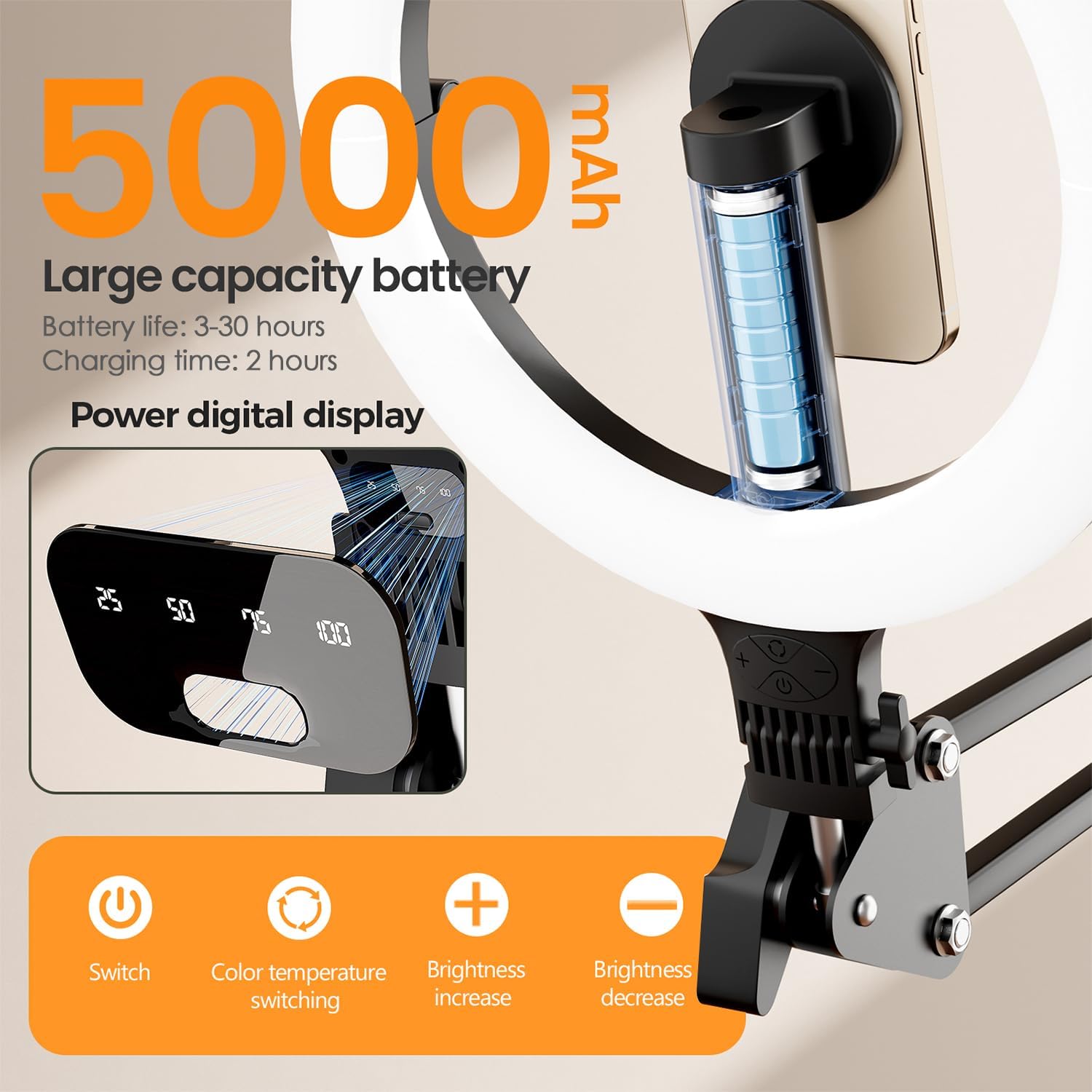 【Ultra-Flexible Overhead Desk Ring Light】 This ring light with phone holder built-in 5000mAh high-capacity battery, anytime, anywhere delivers soft, even lighting that flatters your subject and eliminates harsh shadows. The ultra-flexible arm tilts, swivels, and extends in seconds—ideal for video recording, photography, livestreams, and best lights for content creators.