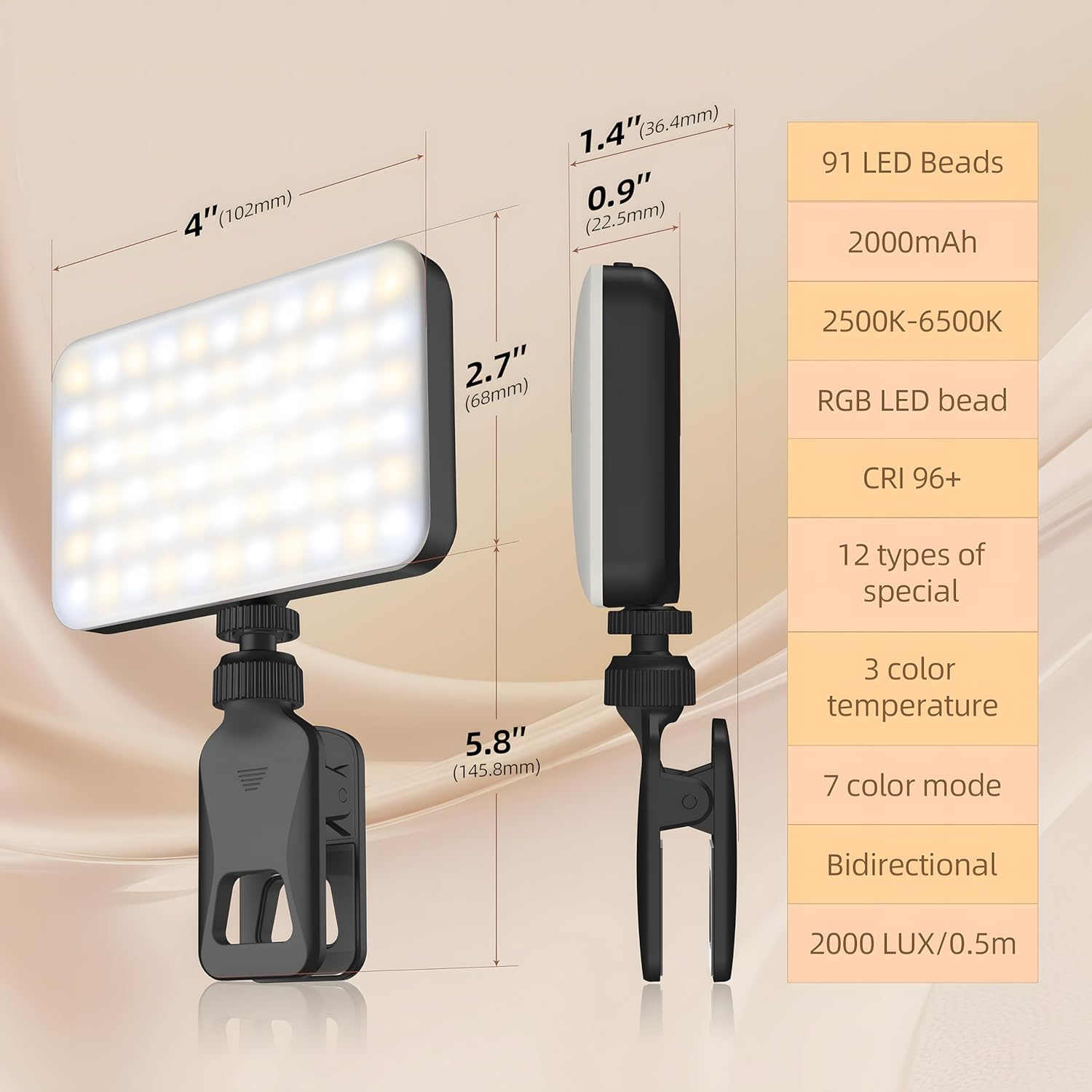 ULTRA-BRIGHT 91 LED PANEL: High Color Rendering Index selfie light with slim LED beads, 3 light modes & 10 brightness levels, color temperature adjustable for flawless makeup, selfies, vlogging