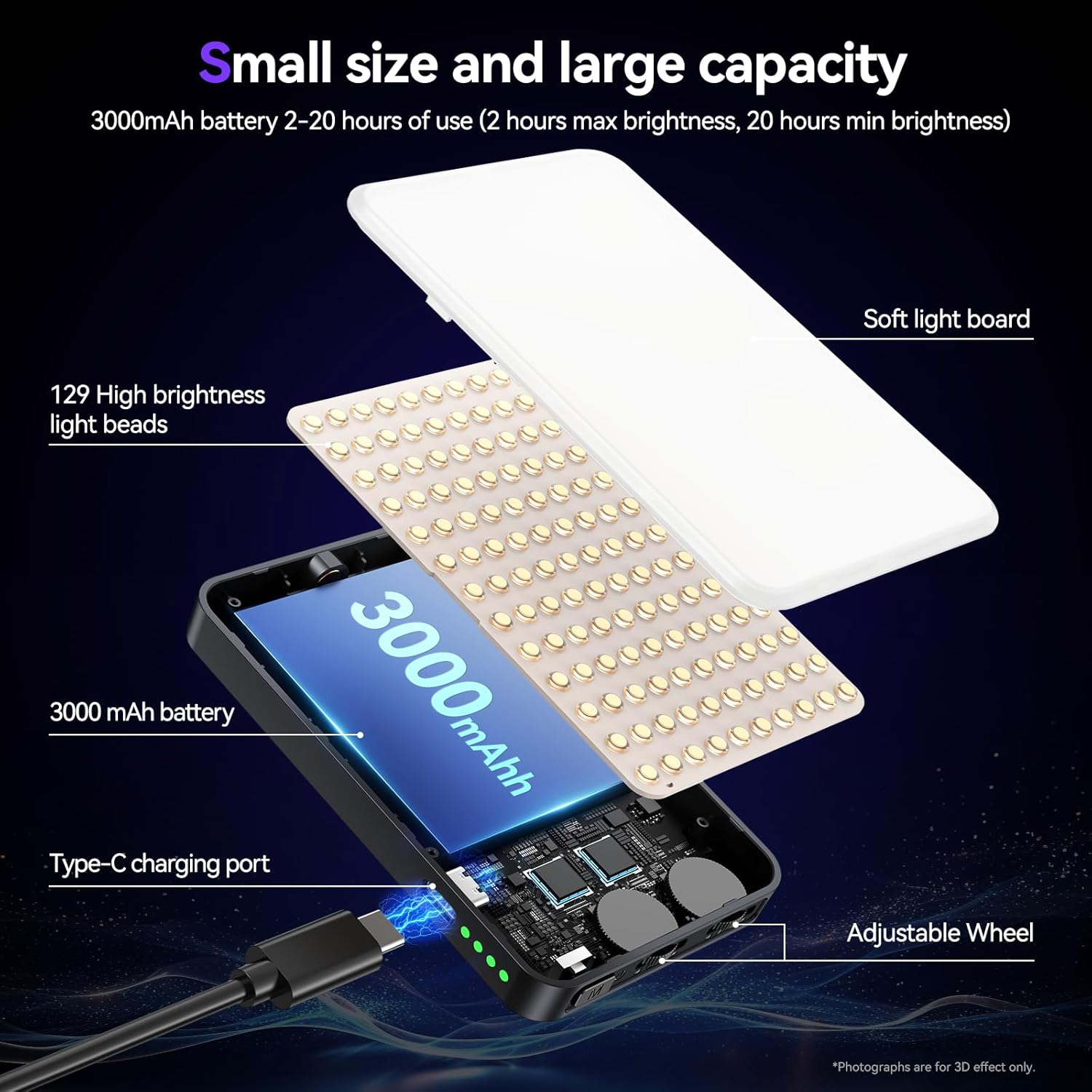 【Small size and large capacity】 Mini portable travel selfie bright light, built-in 3000 mAh battery, 10 lighting modes effective life 2-20 hours, can meet the dim environment of cell phone selfie, food photography fill light, make-up fill light, temporary meeting fill light, outdoor live fill light, colorful RGB atmosphere shaping to add fun to the party and so on