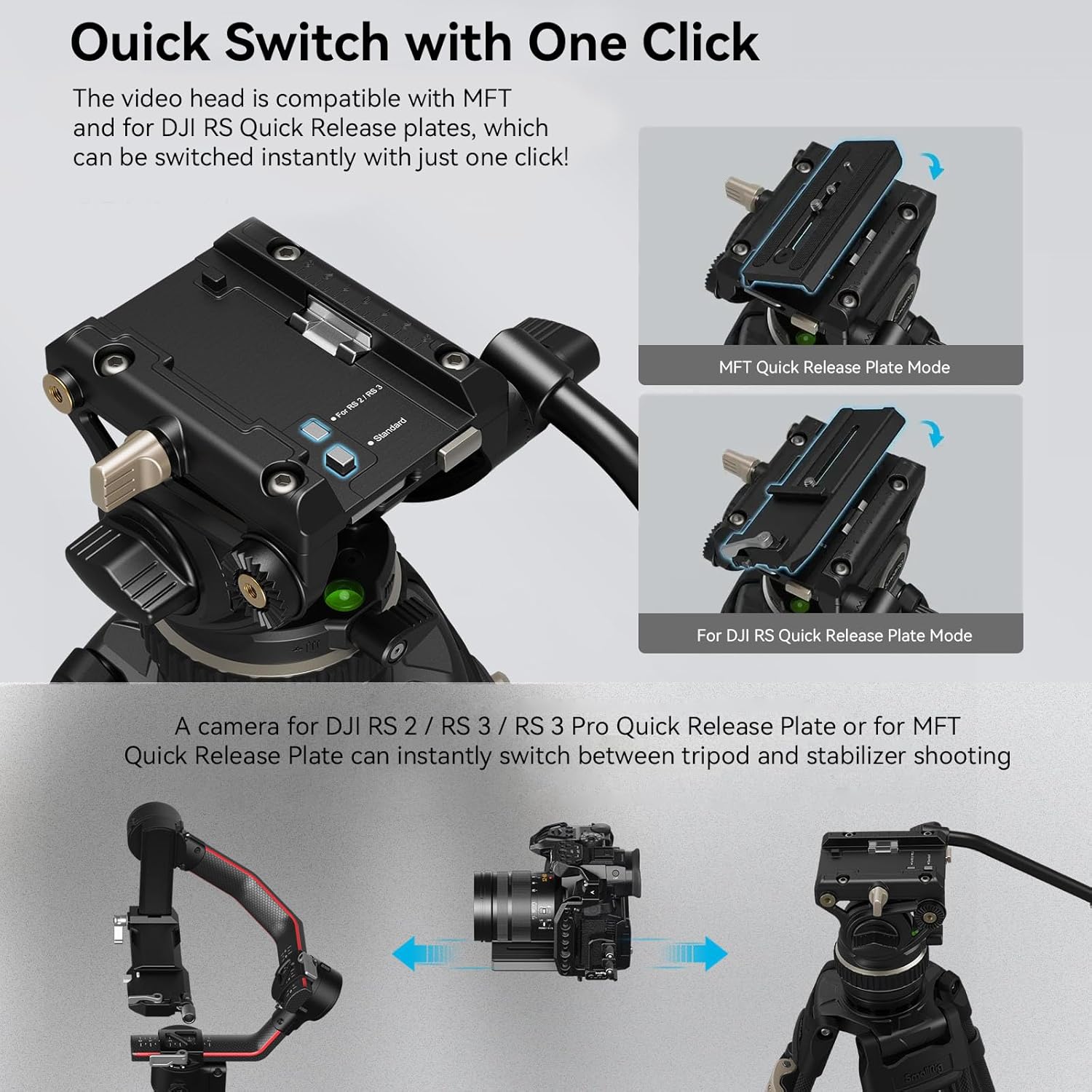 Dual-Mode Quick-Release Plate Mount : The fluid head has a newly designed snap-on quick-release plate mount, a more efficient mounting solution than traditional slide-on ones, which is for DJI RS 2 / RSC 2 / RS 3 / RS 3 Pro / RS 4 / RS 4 Pro quick release plate and for MFT quick release plate compatible to realize a free switch between stabilizer shooting and tripod shooting.