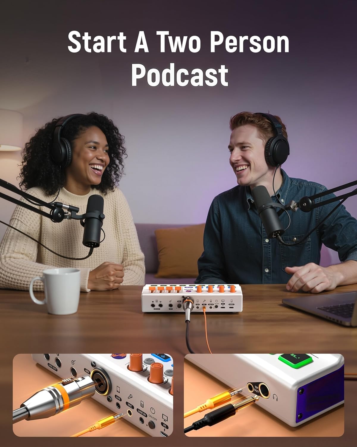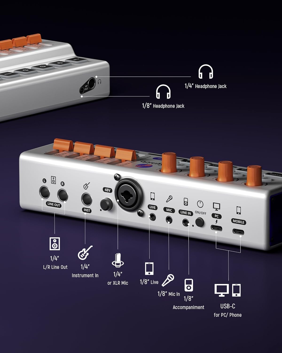 √ [Total Sound Control & Pro-Grade Connectivity]: Instantly mute or adjust Mic, Line In, Line Out, and Monitor volumes with dedicated knobs. 4 faders give you full control over tone, treble, bass, and reverb for a studio-quality mix. Start a two-person podcast with ease, supported by 48V phantom power, XLR/6.35mm combo mic jack, 3.5mm mic input, and dual headphone outputs for broad compatibility and professional performance