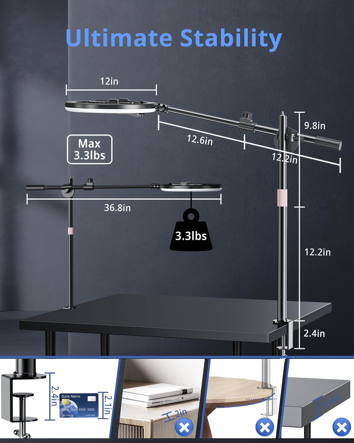 【Adjustable Height & 360° Rotation】 This ring light comes with 2 extendable poles, allowing you to easily adjust both height and length for a wider shooting range. The 360° rotatable ball head ensures you can angle the light to perfection. Capture steady, professional-quality shots from any position