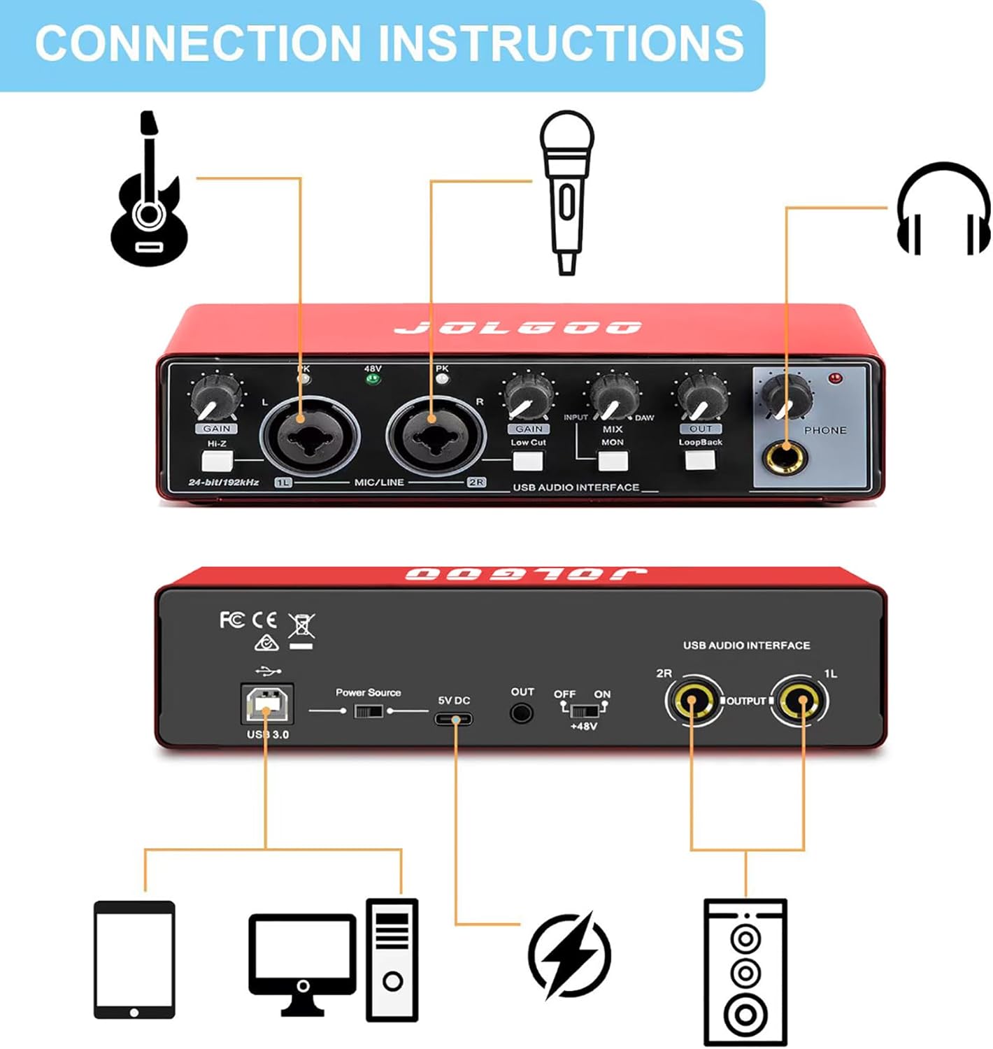 Flexible XLR/Line Inputs with Phantom Power: Two combo ports fit mics and instruments, with 48V power and LED indicators to monitor peaks.