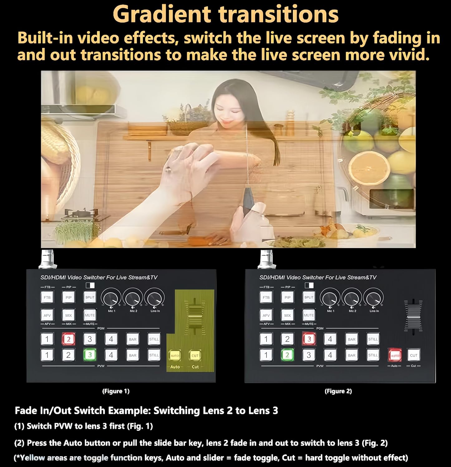 ▶【Support “Fade-in/Fade-out” transitions】This HD Multicamera Video Mixer Switcher Supports Fade in and out transitions between PVM and PGM images by sliding key.