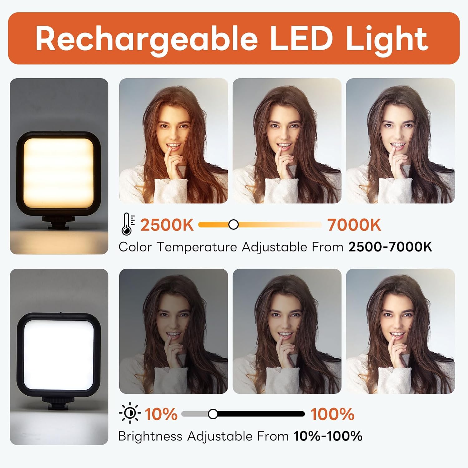 【Rechargeable LED Video Light】Equipped with 62pcs high brightness LED beads, 2500K-7000K color temperature, three level brightness adjustment, easy to control the lighting brightness, providing a bright light source to meet the needs of a variety of scenarios; and it can be easily charged through the USB port.