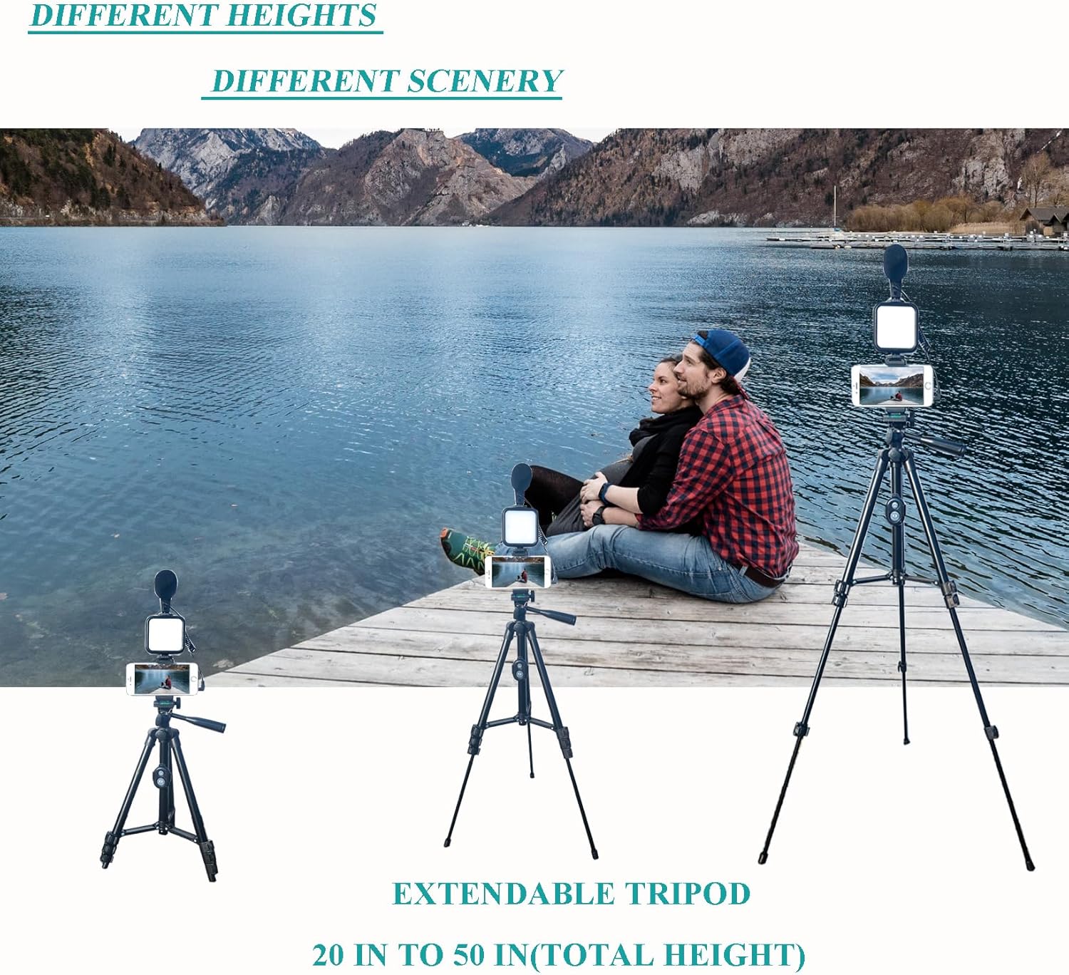 Smartphone vlogging kit : With rechargeable LED light, Shotgun Mic, and adjustable handheld/tabletop and extendable tripods, remote and portable bag.
