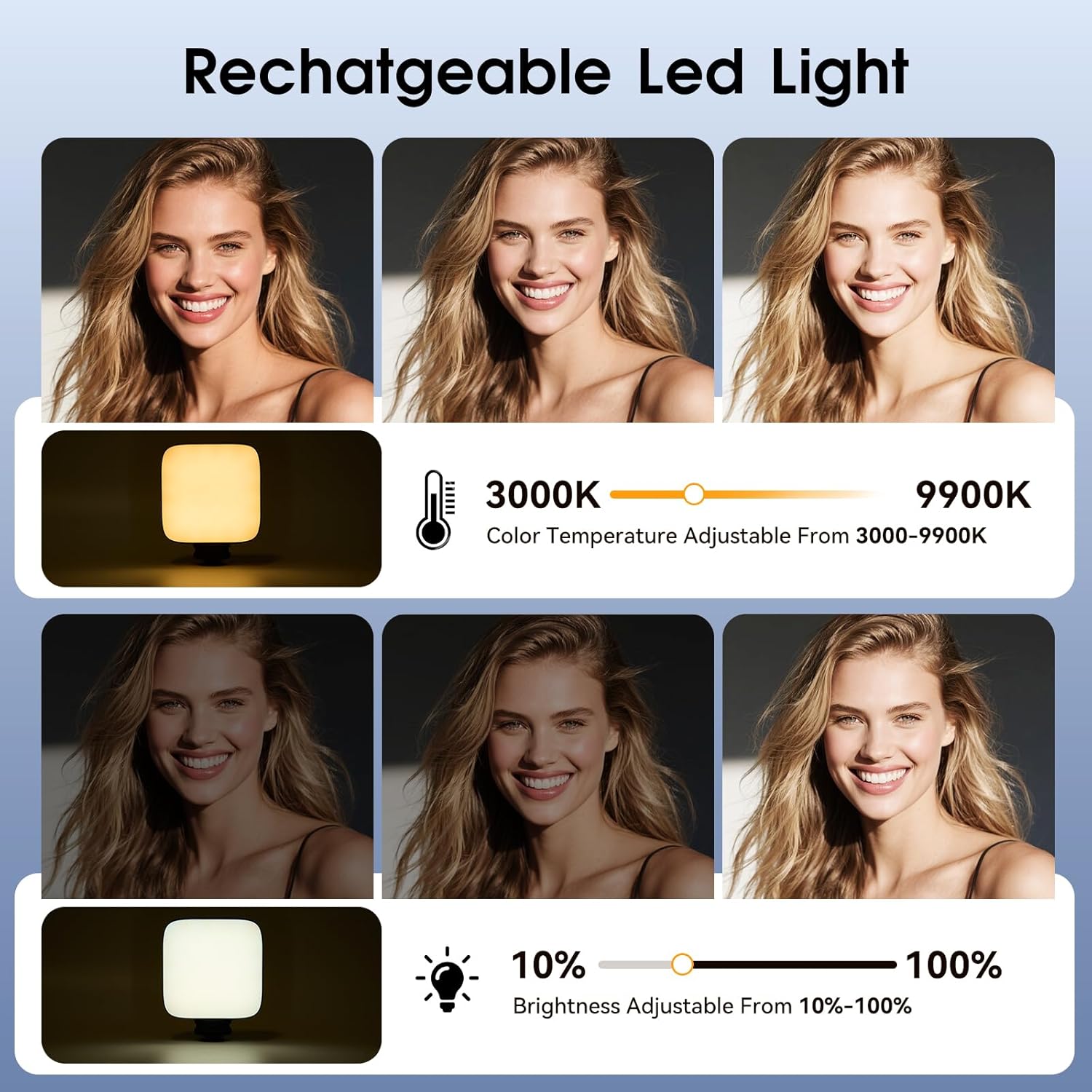 【Rechargeable LED Softbox Light】Color temperature adjustable from 3000K to 9900K, brightness adjustable from 1% to 100%. Equipped with a professional softbox panel for soft, even lighting, suitable for various shooting scenarios and photography needs. Even at night, it lets your beauty shine. Built-in rechargeable battery, easily charged via USB port. Dual phone clamp design accommodates various smartphones and laptops.