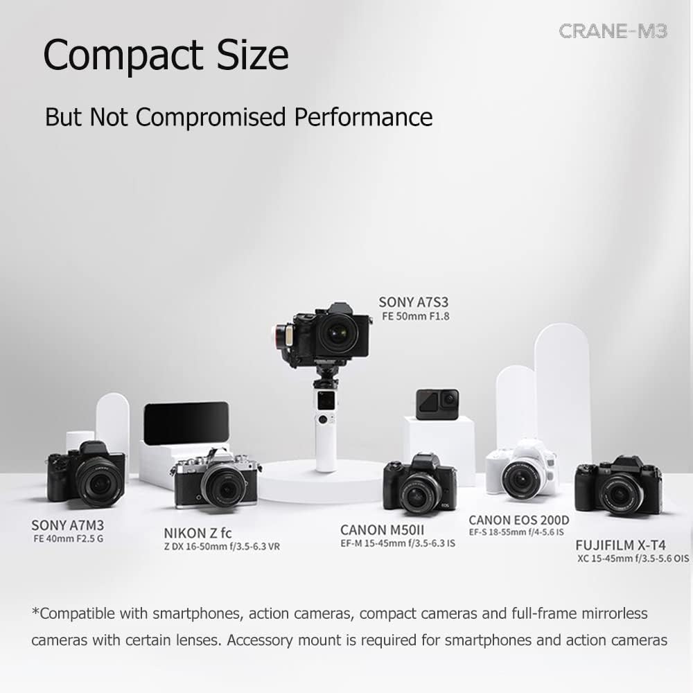【Compact Size,Great Performance】Get rid of the hefty body, Zhiyun Crane M3 is as tiny as a bottle of water. But the upgraded motors with strong torque ensure stable movements and filming with cameras in different sizes.Zhiyun Crane M3 gimbal is compatible with the popular cameras like Sony A7S3/A7M3,Canon EOS 200D/M50II etc..*Accessory mount is required for smartphones and action cameras